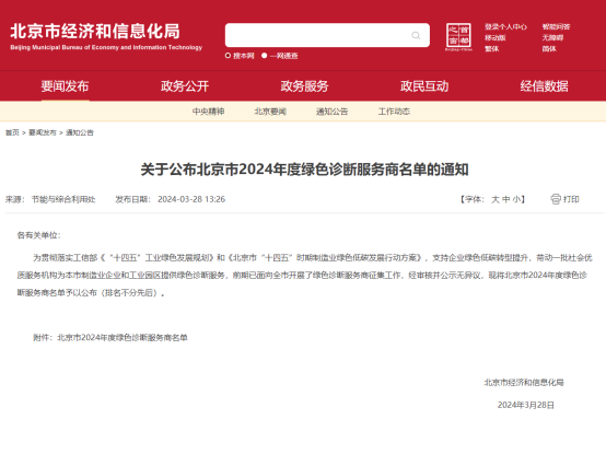 2024年3月28日,北京市經(jīng)濟(jì)和信息化局發(fā)布了《關(guān)于公布北京市2024年度綠色診斷服務(wù)商名單的通知》。經(jīng)審核,我司成功入圍北京市綠色診斷服務(wù)商,為在京規(guī)模以上制造業(yè)企業(yè)、工業(yè)園區(qū)及開(kāi)發(fā)區(qū)提供綠色診斷服務(wù)。北京...