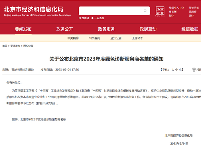 2023年9月4日,北京市經濟和信息化局發(fā)布了《北京市經濟和信息化局關于組織開展2023年度綠色診斷工作的通知》。經審核,我司成功入圍北京市綠色診斷服務商,為在京規(guī)模以上制造業(yè)企業(yè)、工業(yè)園區(qū)及開發(fā)區(qū)提供綠色診斷...