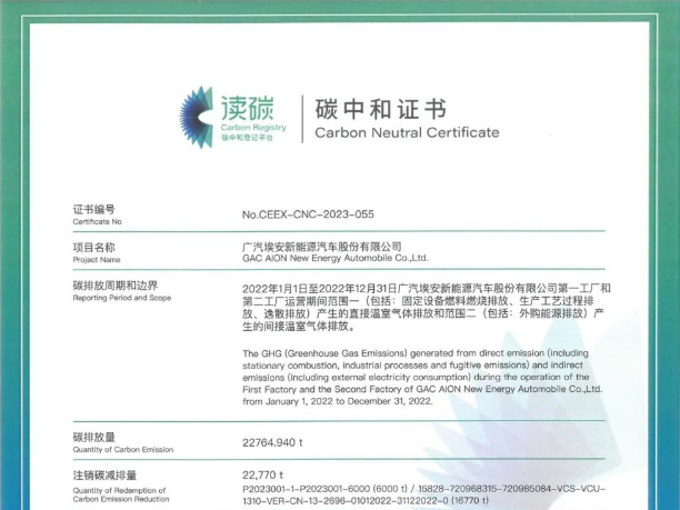 日前,廣汽埃安智能生態(tài)工廠正式獲得廣州碳排放權交易中心出具的碳中和證書,實現2022年度生產運營零碳排放,同時也響應了廣汽集團的“GLASS綠凈計劃”,達成將廣汽埃安打造成廣汽首個“零碳工廠”的既定目標。為助...